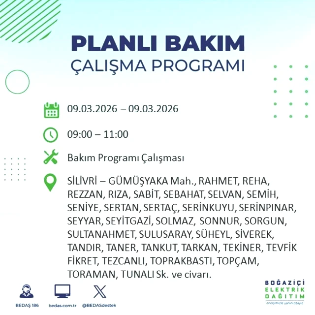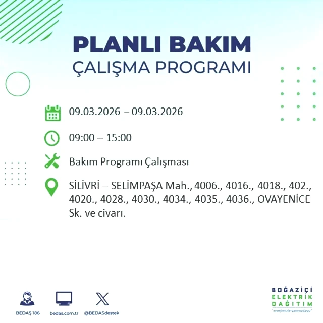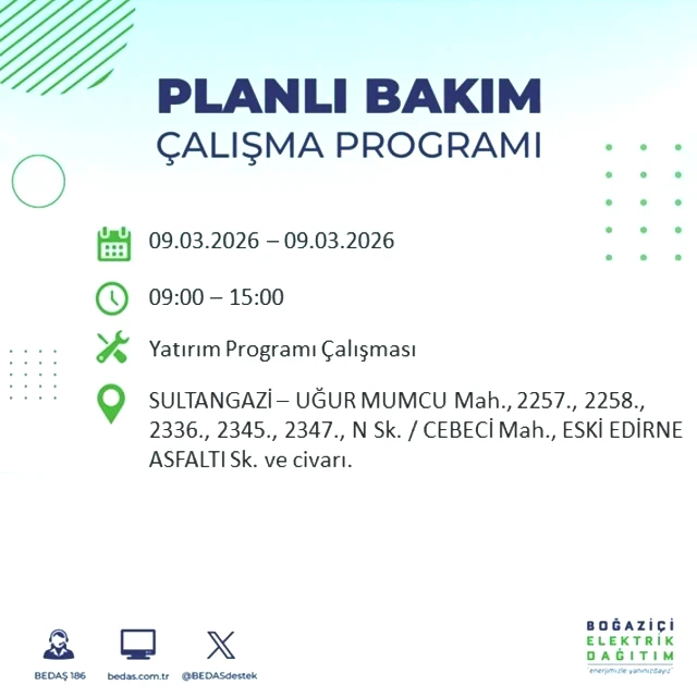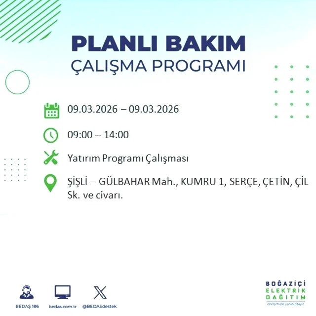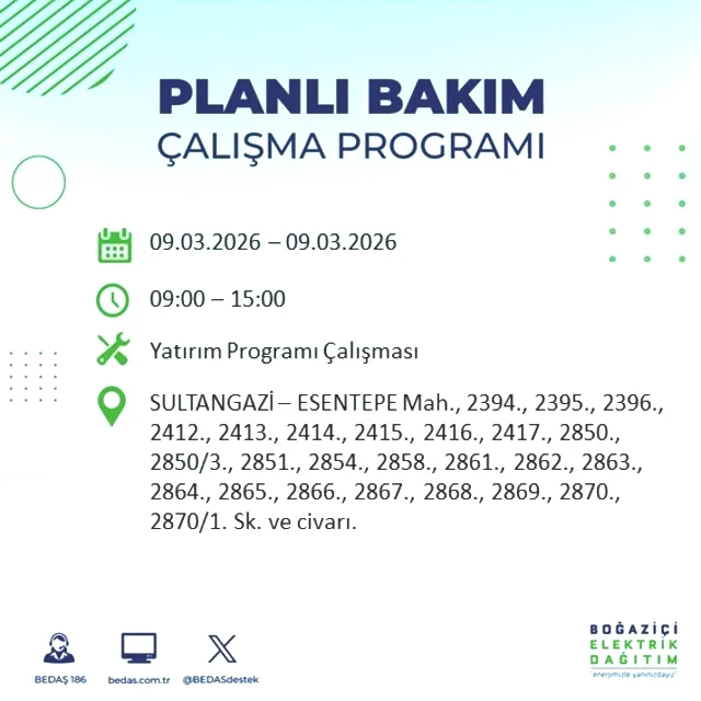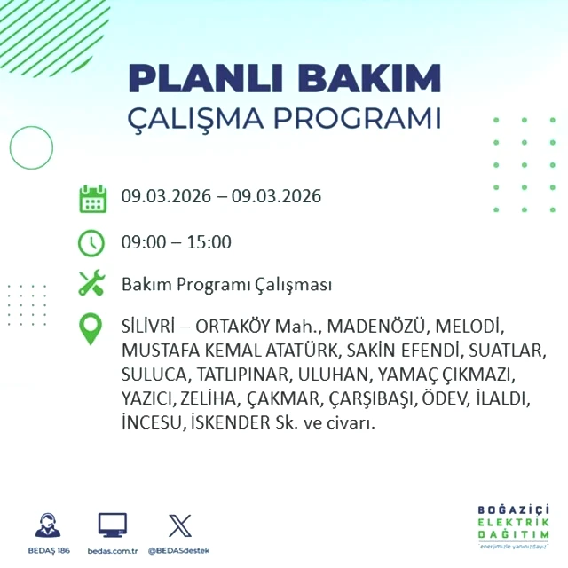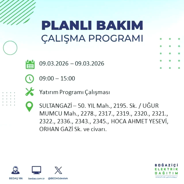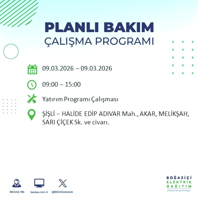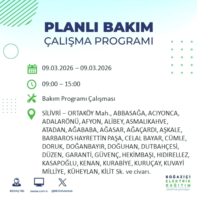 9 Mart Pazartesi günü elektrik kesintileriyle ilgili planlar duyuruldu. Boğaziçi Elektrik Dağıtım A.Ş. (BEDAŞ), bakım ve yatırım projeleri kapsamında şehir genelinde enerji kesintileri olacağını bildirdi. Şirketin programına göre, bu kesintiler çeşitli ilçelerde belirlenen saat dilimlerinde gerçekleşecek. Ayrıntılar ise şu şekilde...