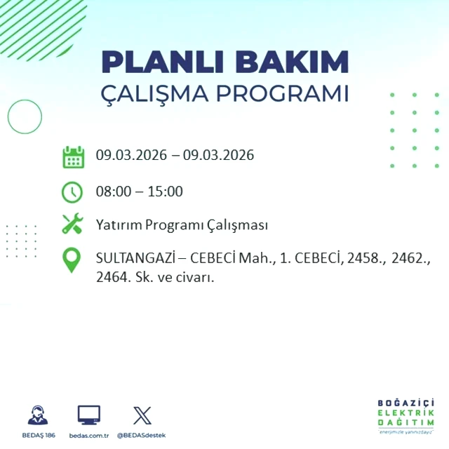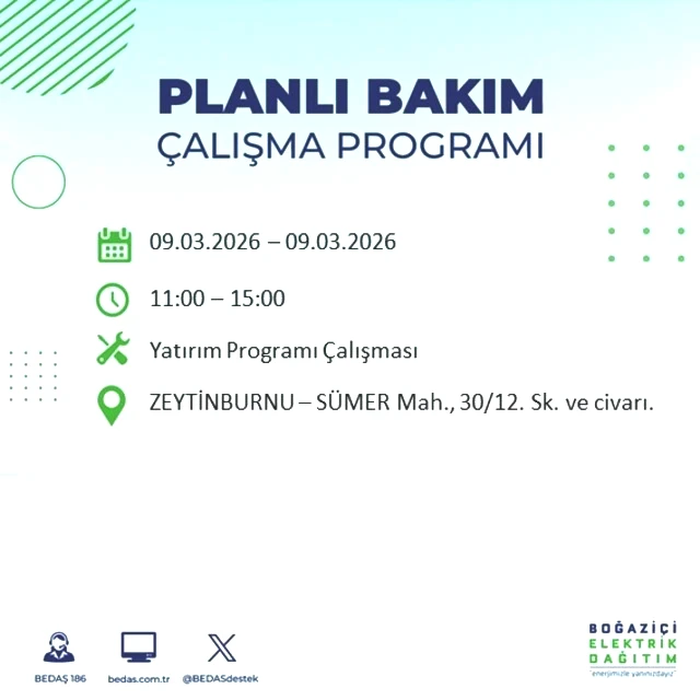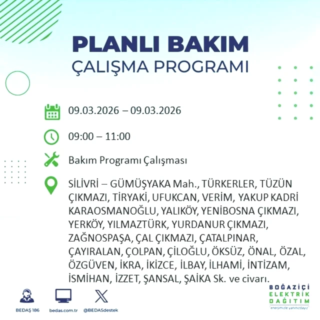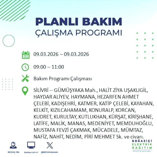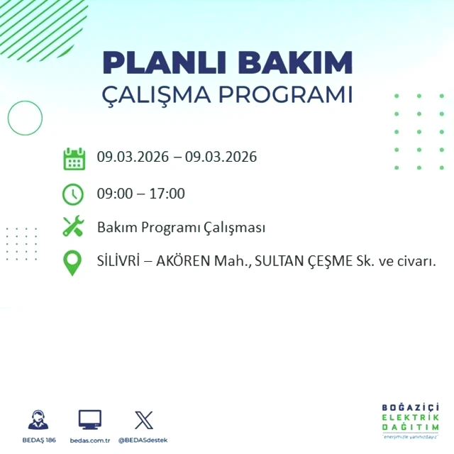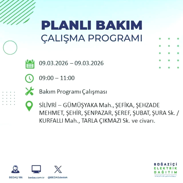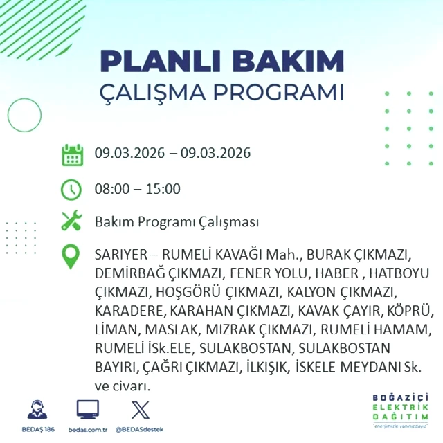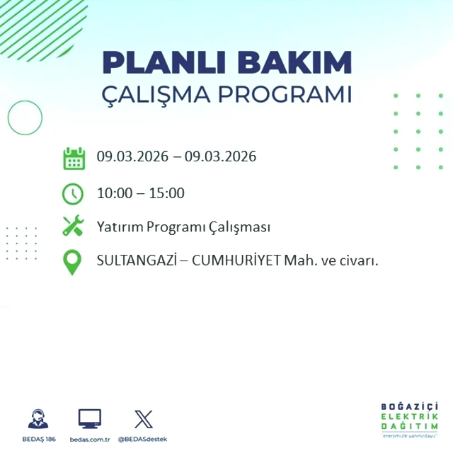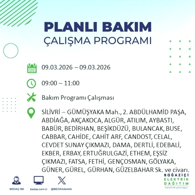 9 Mart Pazartesi günü elektrik kesintileriyle ilgili planlar duyuruldu. Boğaziçi Elektrik Dağıtım A.Ş. (BEDAŞ), bakım ve yatırım projeleri kapsamında şehir genelinde enerji kesintileri olacağını bildirdi. Şirketin programına göre, bu kesintiler çeşitli ilçelerde belirlenen saat dilimlerinde gerçekleşecek. Ayrıntılar ise şu şekilde...